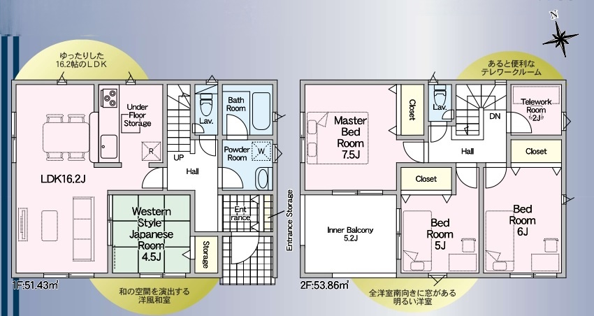 | 間取内容 | LDK16.2畳 1階 和室4.5畳 1階 洋室7.5畳 2階 洋室5畳 2階 洋室6畳 2階 S2畳 2階 テレワークルーム |